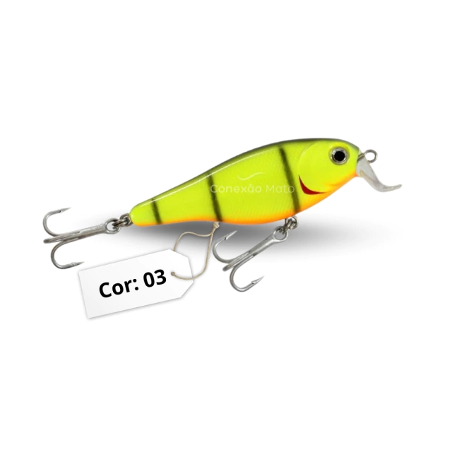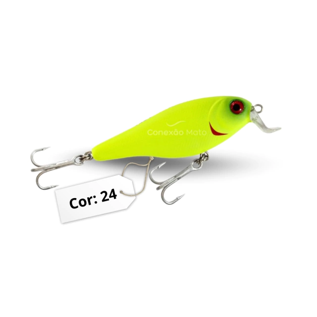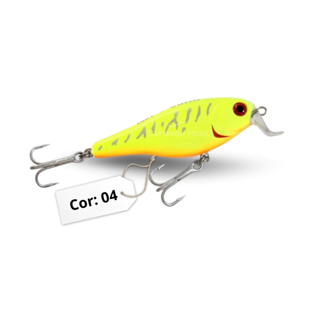 Possui pintura em tinta automotiva, efeito rattlin e tem barbela de direcionamento que promove maior ação da isca na água.