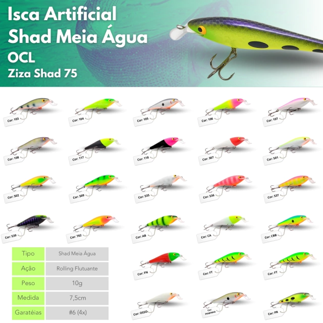 A Isca Artificial Shad Meia Água OCL Ziza Shad 75 By Fabio Baca é uma das preferidas pelos pescadores, sendo conhecida por sua incrível performance. Seu corpo em formato de peixe pequeno, como um lambari, possui uma espessura fina que facilita as fisgadas. Além disso, sua barbela em formato "L" proporciona uma ação irresistível para predadores, especialmente quando combinada com o equilíbrio único das iscas da OCL.