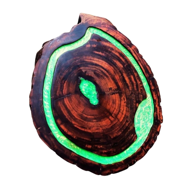 Este lindo exemplar ainda possui canaletas preenchidas com Resina Epóxi tingida com Pigmento Perolado Verde Claro.
