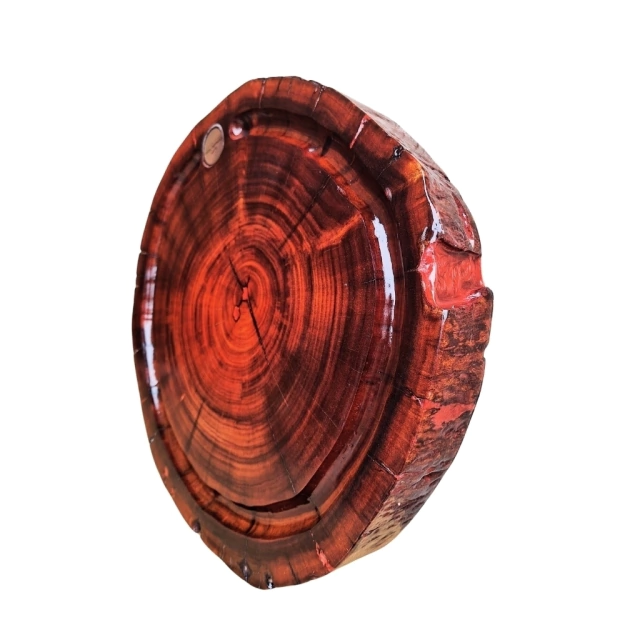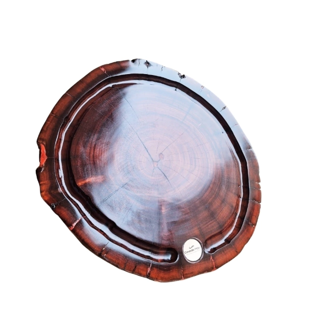 Este lindo exemplar ainda possui canaletas largas preenchidas com Resina Epóxi transparente, e detalhes em resina epóxi vermelho perolado.